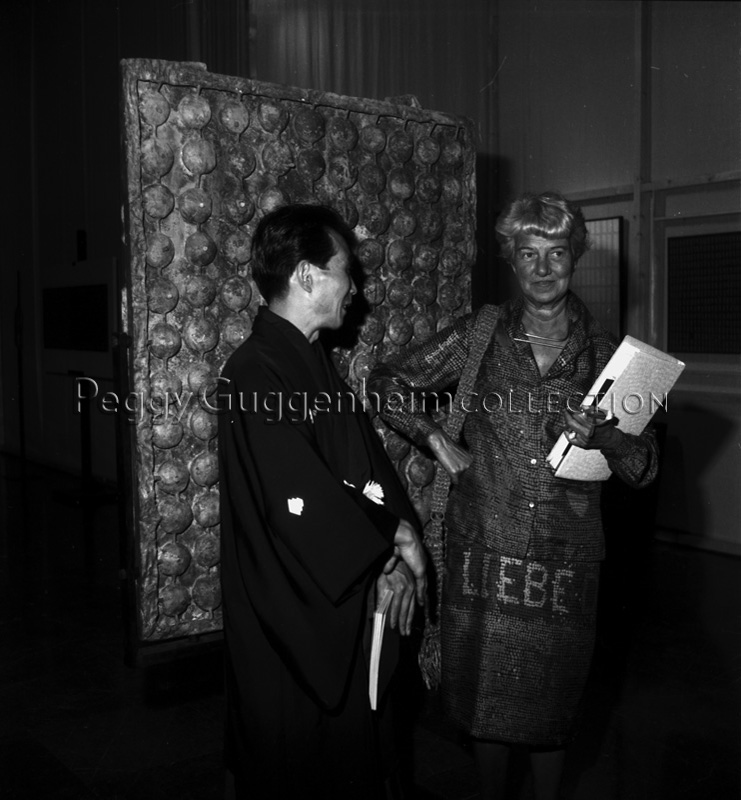 Tomonori Toyofuku e Peggy Guggenheim (da sinistra a destra) durante un'esposizione delle opere dell'artista giapponese; anni '60.
