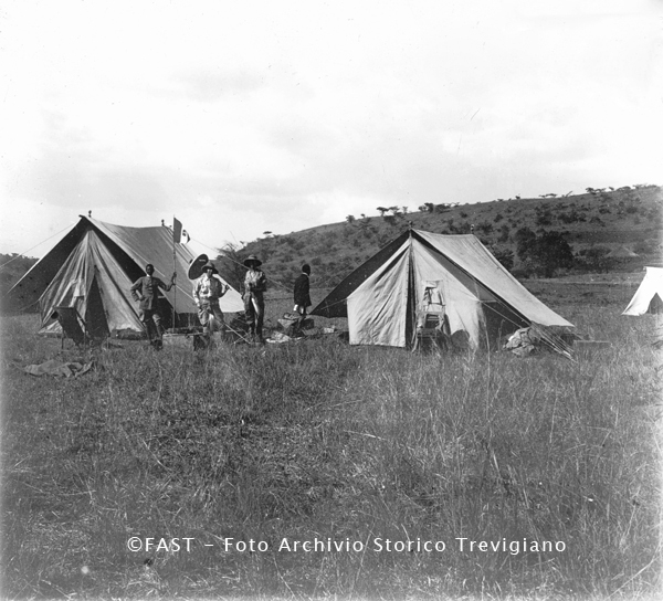 Raimondo e Bianca Franchetti con due Ascari davanti alle tende accampate sull'altopiano della Dancalia etiope.