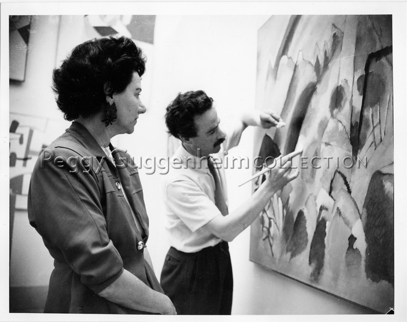 Peggy Guggenheim and Angelo Brotto, next to Vasily Kandinsky, Landscape with Red Spots, No. 2 (1913, PGC), at the Greek Pavilion, where she exhibited her collection, 24th Venice Biennale, 1948.