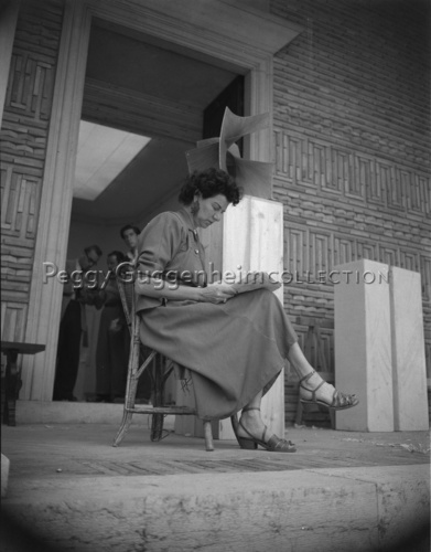 Peggy Guggenheim davanti al padiglione greco, dove espone la sua collezione, alla XXIV Biennale d'Arte di Venezia; alle sue spalle Antoine Pevsner, "Superficie sviluppabile" (1941, PGC); 1948.