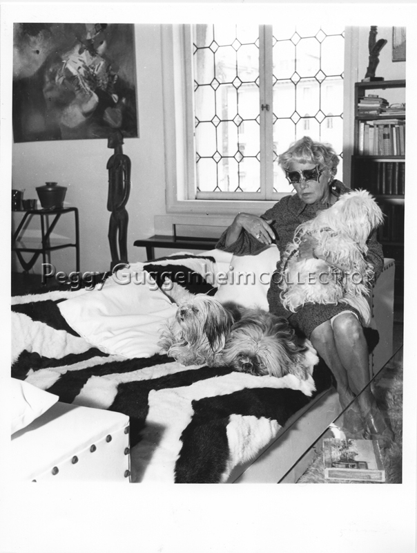 Peggy Guggenheim with her Lhasa Apsos terriers in the library of Palazzo Venier dei Leoni; to the left, cropped, Edmondo Bacci, "Event #247" (1956, PGC), Venice, 1973