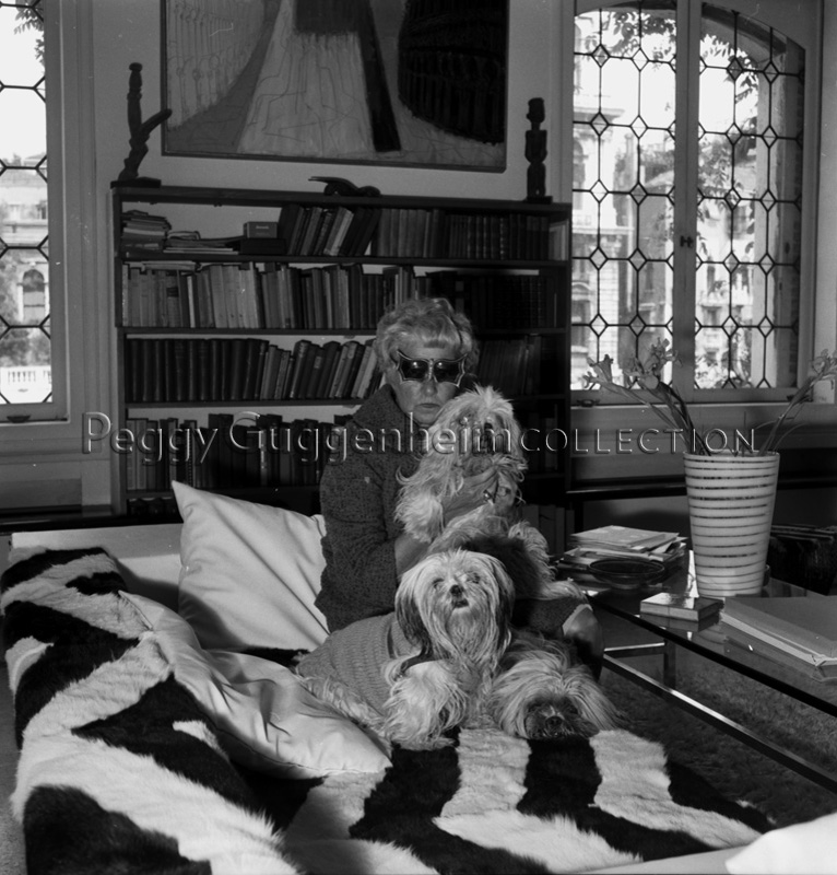 Peggy Guggenheim con i suoi terrier Lhasa Apsos nella biblioteca di Palazzo Venier dei Leoni, Venezia, 1973