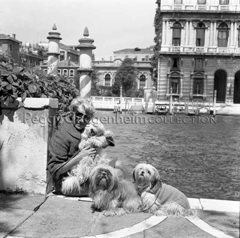 Peggy Guggenheim con i suoi terrier Lhasa Apsos, sulla terrazza di Palazzo Venier dei Leoni; Venezia, 1973
