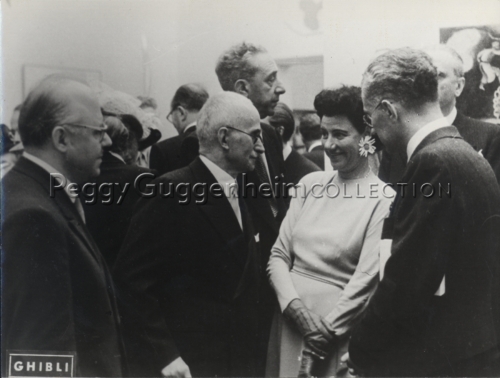 Peggy Guggenheim assieme a Elio Zorzi, il Presidente Luigi Einaudi e Rodolfo Pallucchini (da sinistra a destra) al padiglione greco della XXIV Biennale dArte di Venezia .
