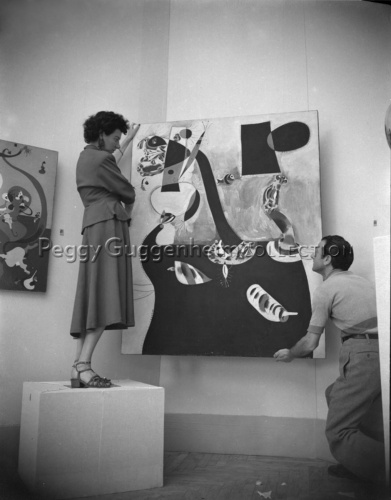 Peggy Guggenheim sorregge la tela di Joan Mirò "Donna Seduta II" del 1939 durante l'allestimento della sua collezione al Padiglione Greco della XXIV Biennale dArte di Venezia; alle sue spalle il dipinto di Joan Miró, Interno olandese II del 1928.