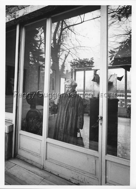 Peggy Guggenheim in the entrance hall of Palazzo Venier dei Leoni; through the window (to her right) Antoine Pevsner, “Developable Surface” (1941, PGC); Venice, 1962