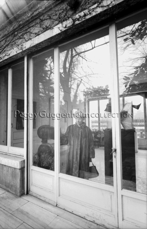 Peggy Guggenheim in the entrance hall of Palazzo Venier dei Leoni; through the window (to her right) Antoine Pevsner, “Developable Surface” (1941, PGC); Venice, 1962