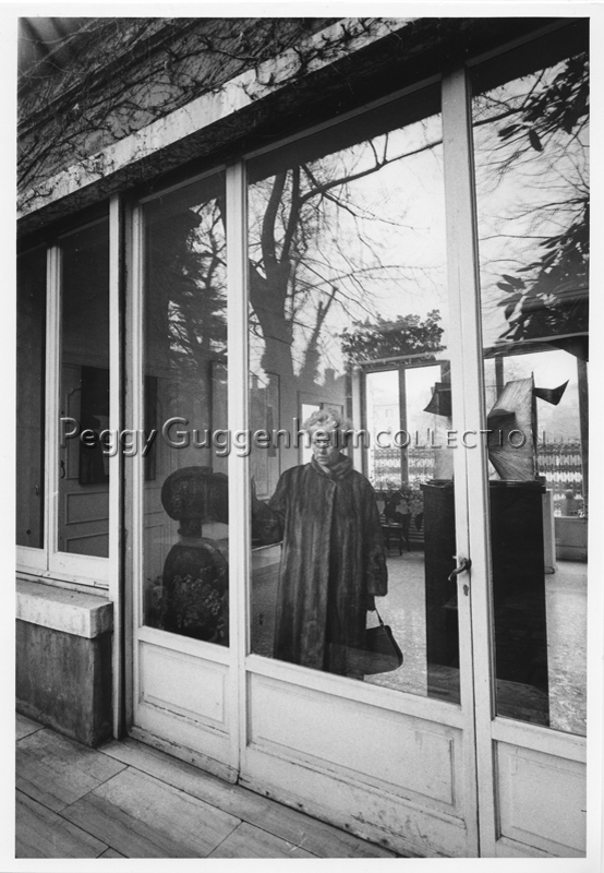 Peggy Guggenheim in the entrance hall of Palazzo Venier dei Leoni; through the window (to her right) Antoine Pevsner, Developable Surface (1941, PGC); Venice, 1962