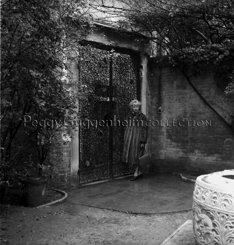Peggy Guggenheim at Palazzo Venier dei Leoni next to Claire Falkenstein, "Entrance Gates to the Palazzo" (1961, PGC); Venice, 1973