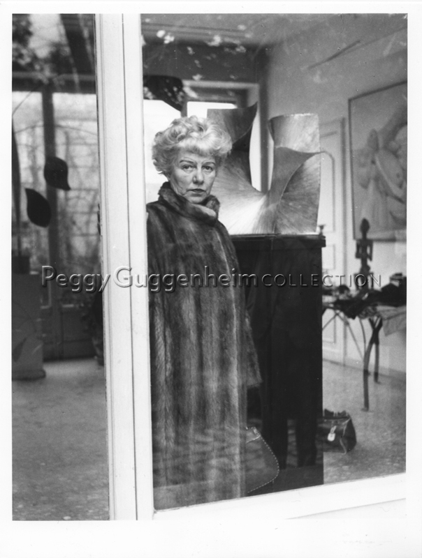 Peggy Guggenheim nella sala dingresso di Palazzo Venier dei Leoni; alle sue spalle Antoine Pevsner, "Superficie sviluppabile" (1941, PGC); Venezia, 1973