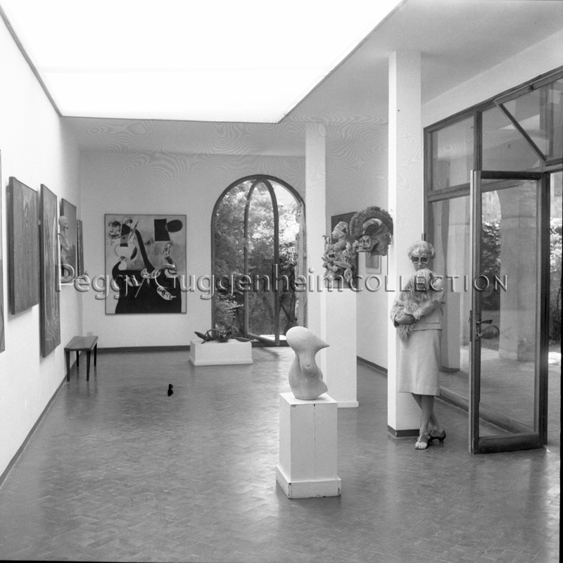 Peggy Guggenheim in the barchessa of Palazzo Venier dei Leoni; to the center Jean Arp, Crown of Buds I (1936, PGC); in the background Alberto Giacometti, Woman with Her Throat Cut (1932, PGC), and Joan Miró, Seated Woman II (1939, PGC); Venice, 1973
