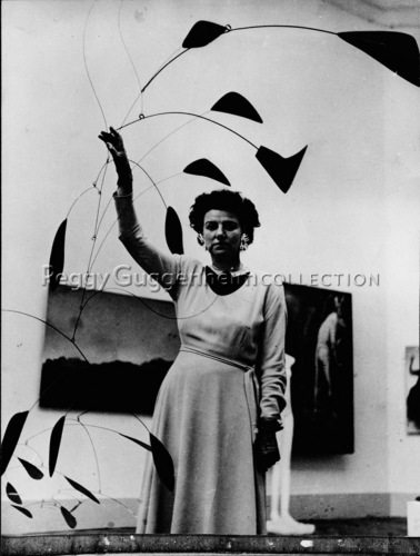 Peggy Guggenheim accanto all'opera di Alexander Calder - "Arco di Petali" (1941), nel padiglione greco alla XXIV Biennale di Arte di Venezia, dove espone la sua collezione.