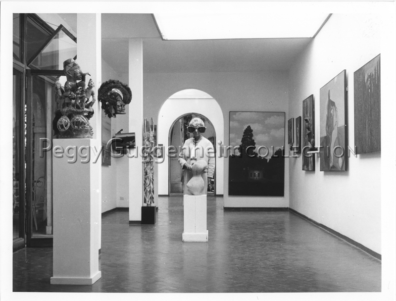 Peggy Guggenheim in the barchessa of Palazzo Venier dei Leoni behind Jean Arp, "Crown of Buds I" (1936, PGC); on the wall, in the background, René Magritte, Empire of Light (1953-54, PGC); Venice, 1973