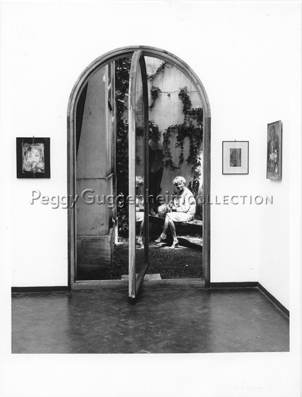 Peggy Guggenheim at Palazzo Venier dei Leoni seated on Tomonori Toyofukus wooden sculpture, Drifting No. 2 (1959, PGC); in the foreground (left to right) Victor Brauner, "Untitled" (1954, PGC), "Untitled" (1945, PGC), "The Surrealist" (1947, PGC), and "Consciousness of Shock" (1951, PGC); Venice, 1973