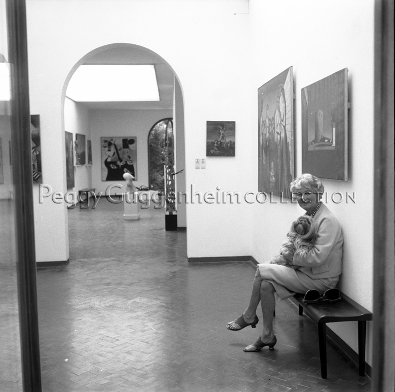 Peggy Guggenheim nella barchessa di Palazzo Venier dei Leoni; sulle pareti in primo piano (da sinistra a destra) Leonor Fini, "La pastorella delle sfingi" (1941, PGC), Paul Delvaux, "L'aurora" (1937, PGC), e Giorgio de Chirico, "La torre rossa" (1913, PGC); Venezia, 1973