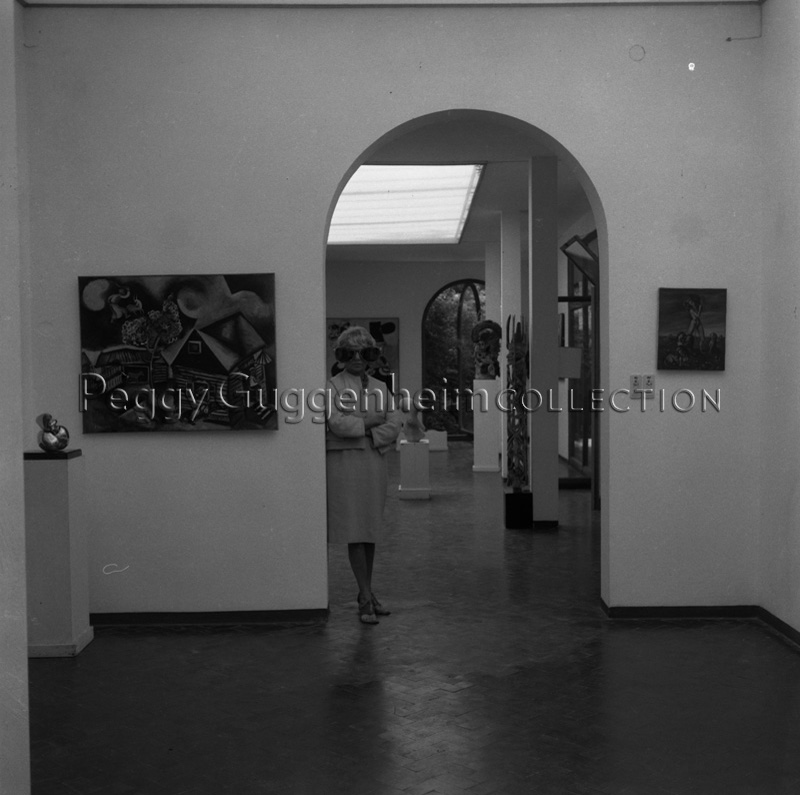 Peggy Guggenheim nella barchessa di Palazzo Venier dei Leoni; alla parete (da sinistra a destra) Marc Chagall, "La pioggia" (1911, PGC), e Leonor Fini, "La pastorella delle sfingi" (1941, PGC); Venezia 1973