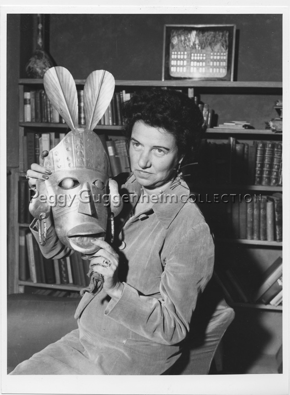 Peggy Guggenheim in the library of Palazzo Venier dei Leoni with a mask from her collection of African artifacts; in the background Joseph Cornell, Setting for a Fairy Tale (1942, PGC); Venice, 1949