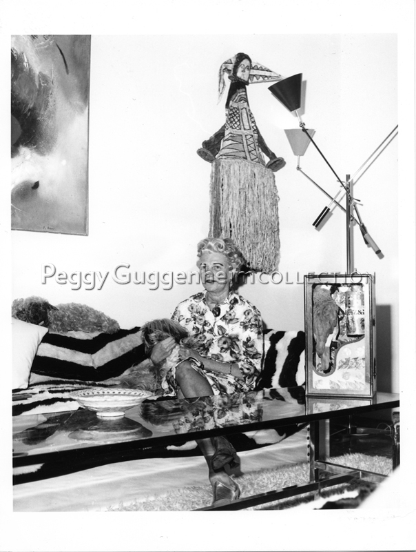 Peggy Guggenheim nella biblioteca di Palazzo Venier dei Leoni, alle sue spalle (da sinistra a destra) Edmondo Bacci, "Avvenimento #247" (1956, PGC), e una maschera della sua collezione di sculture dalle Americhe; sul tavolo Joseph Cornell, "Pappagallo che predice il futuro" (1937-38 c., PGC); Venezia, 1973