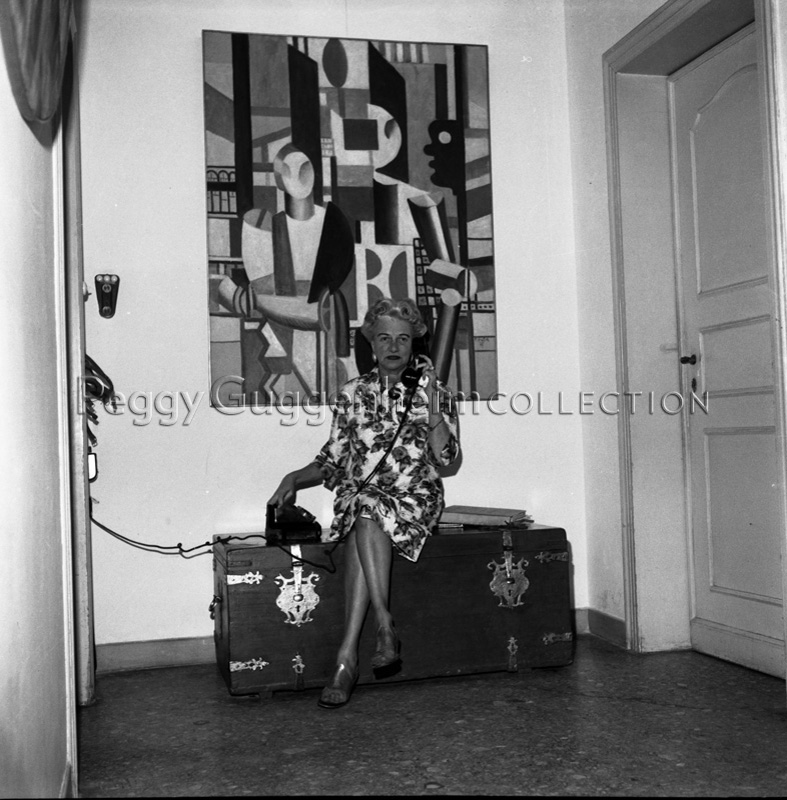 Peggy Guggenheim al telefono a Palazzo Venier dei Leoni, alle sue spalle Fernand Léger, "Uomini in città" (del 1919, PGC); Venezia, 1973