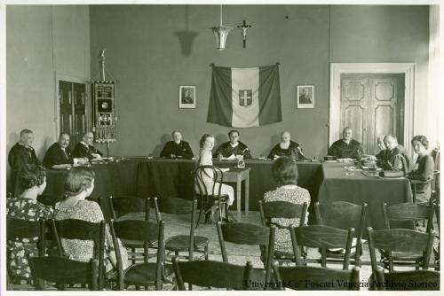 - NOTIZIE STORICO CRITICHE Fotografia individuata da Giannantonio Paladini e soggettata: "Esami di laurea 1937 Novembre" (cartella n. 17). Sul medesimo supporto (busta di carta intestata "Università Ca' Foscari Venezia") compare anche la nota manoscritta a penna "Saggio treccani n. 3". Un ulteriore supporto di carta dell'epoca contenuto nella medesima cartella riporta la nota dattiloscritta: "Esami di laurea 1937 Novembre".