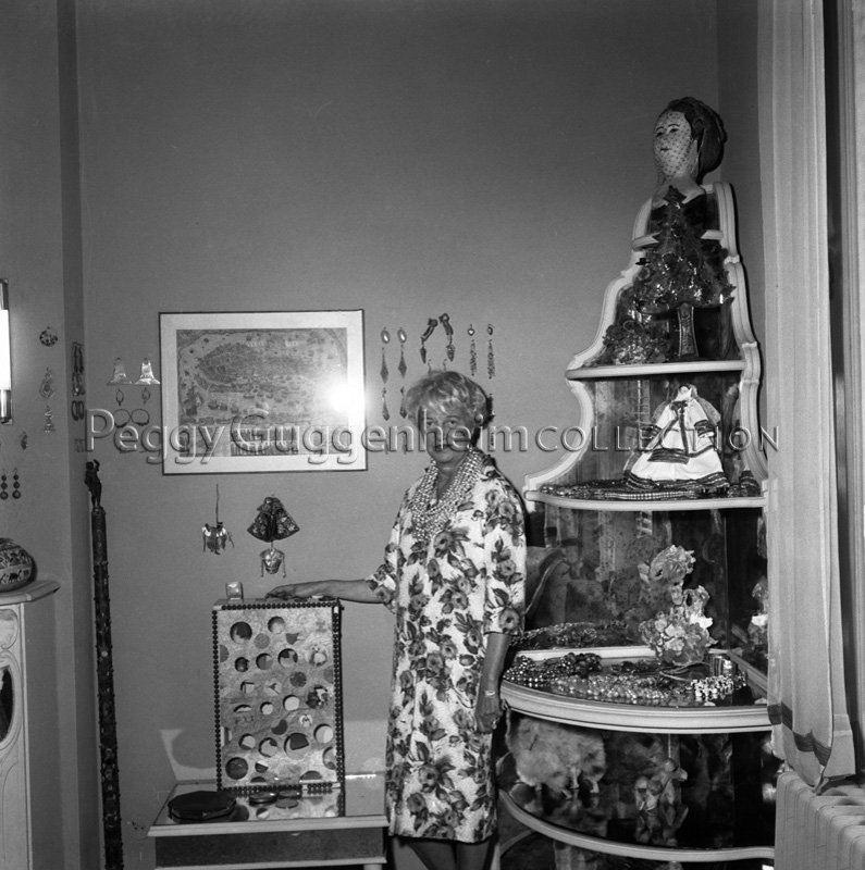 Peggy Guggenheim nella sua camera da letto a Palazzo Venier dei Leoni accanto a Joseph Cornell, "'Shoot-the-Chutes' svizzero" (1941, PGC); alle pareti la sua collezione di orecchini; Venezia, 1973