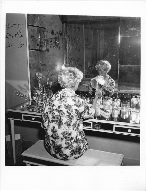 Peggy Guggenheim nella sua camera da letto a Palazzo Venier dei Leoni; sul mobile da toletta una bottiglia di Laurence Vail; alla parete sono appesi gli orecchini creati per lei da Alexander Calder; Venezia, 1973