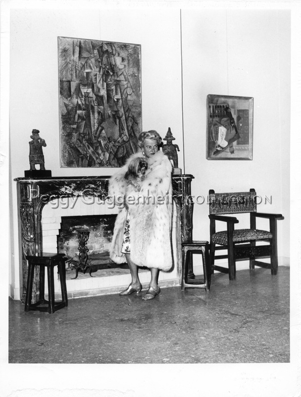 Peggy Guggenheim a Palazzo Venier dei Leoni; sulla parete (da sinistra a destra) Juan Gris, "Bottiglia di rum e giornale" (1914, PGC), Pablo Picasso, "Il poeta" (1911, PGC) e "Pipa, bicchiere, bottiglia di Vieux Marc" (1914, PGC); Venezia, 1973
