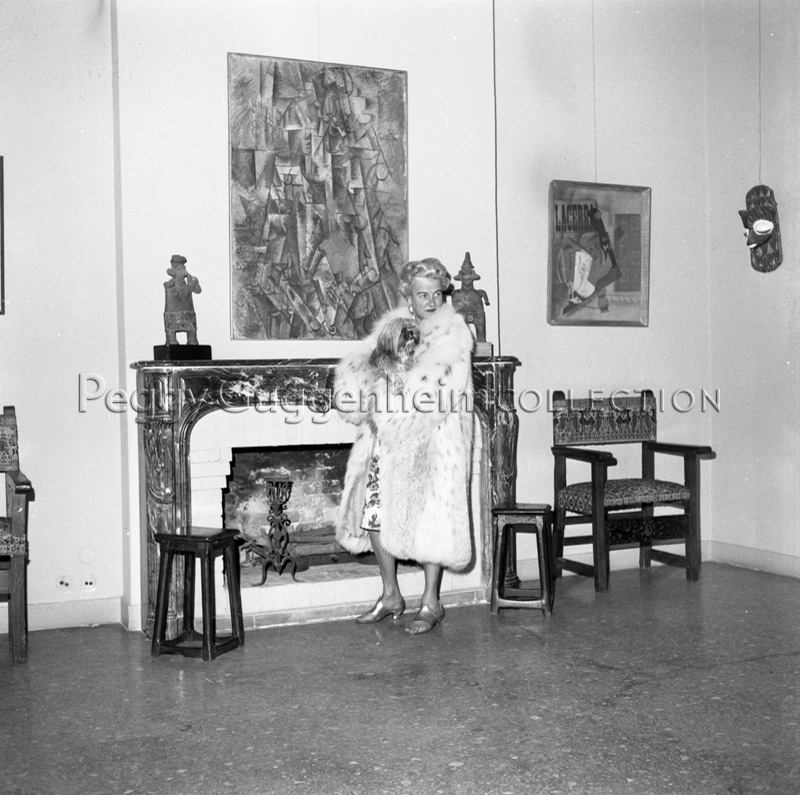 Peggy Guggenheim a Palazzo Venier dei Leoni; sulla parete (da sinistra a destra) Juan Gris, "Bottiglia di rum e giornale" (1914, PGC), Pablo Picasso, "Il poeta" (1911, PGC) e "Pipa, bicchiere, bottiglia di Vieux Marc" (1914, PGC); Venezia, 1973