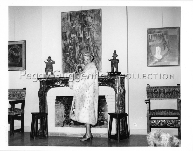 Peggy Guggenheim a Palazzo Venier dei Leoni; sulla parete (da sinistra a destra) Juan Gris, "Bottiglia di rum e giornale" (1914, PGC), Pablo Picasso, "Il poeta" (1911, PGC) e "Pipa, bicchiere, bottiglia di Vieux Marc" (1914, PGC); Venezia, 1973