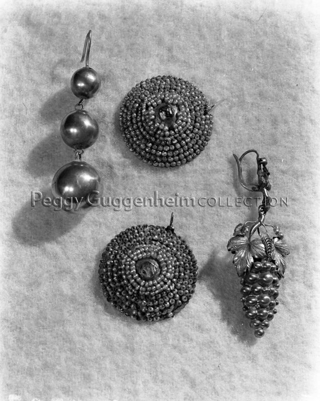 Alcuni orecchini di Peggy Guggenheim: (da sinistra a destra) un orecchino moderno spagnolo, due orecchini provenienti dagli scavi di Creta, un orecchino francese del XIX sec.; 1949.