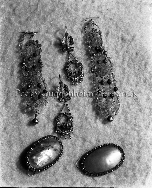 A pair of 19th-century American earrings (center) and two pairs of late 18th-century French earrings owned by Peggy Guggenheim; 1949.