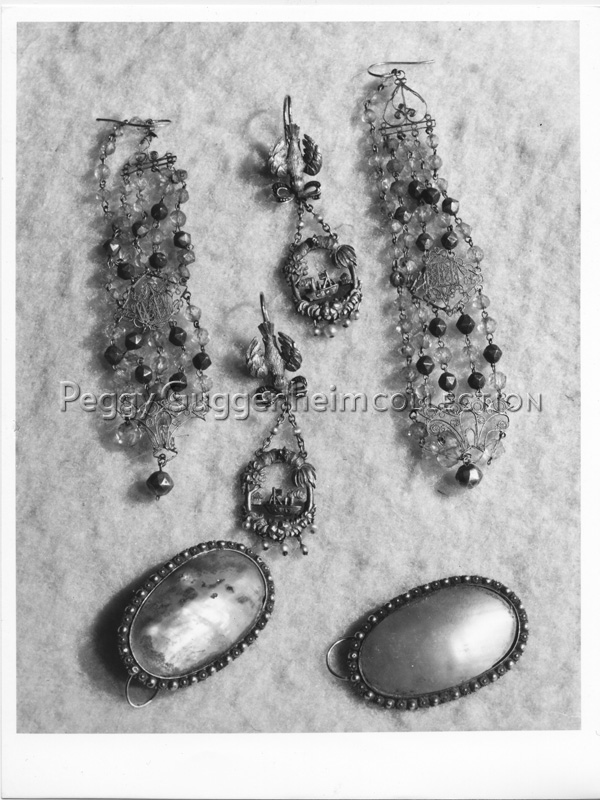 A pair of 19th-century American earrings (center) and two pairs of late 18th-century French earrings owned by Peggy Guggenheim; 1949.