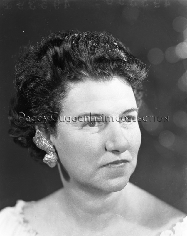 Peggy Guggenheim con un paio di orecchini in legno dorato; 1949.