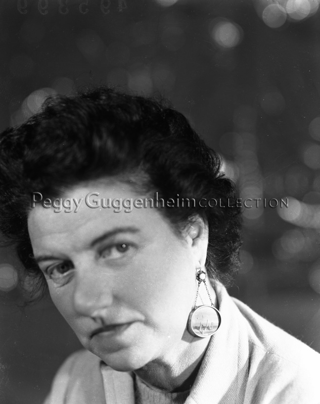Peggy Guggenheim con un orecchino dipinto da Yves Tanguy, 1949.