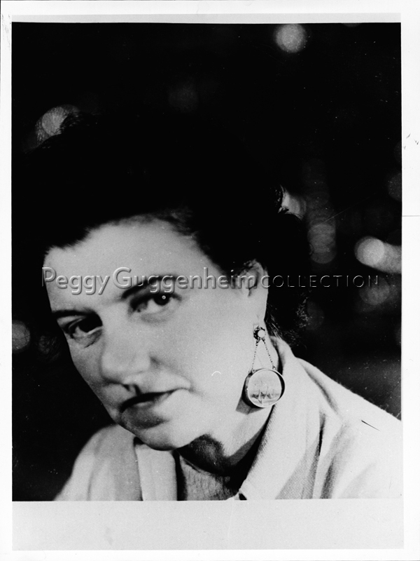 Peggy Guggenheim con un orecchino dipinto da Yves Tanguy, 1949.