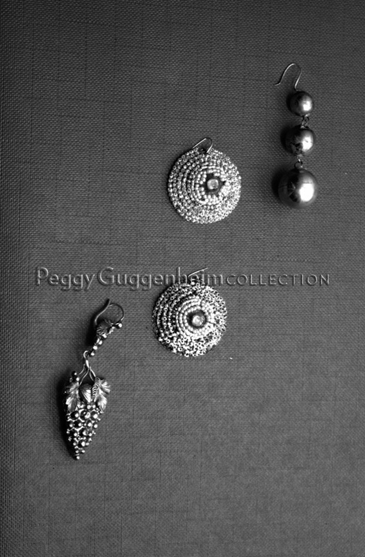 Alcuni orecchini di Peggy Guggenheim: (da destra a sinistra) un orecchino moderno spagnolo, due orecchini provenienti dagli scavi di Creta, un orecchino francese del XIX sec.