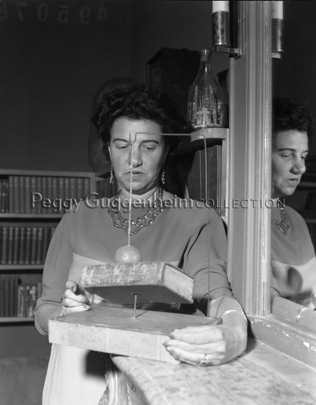 Peggy Guggenheim at Palazzo Venier dei Leoni with a work by Joseph Cornell; Venice, 1949