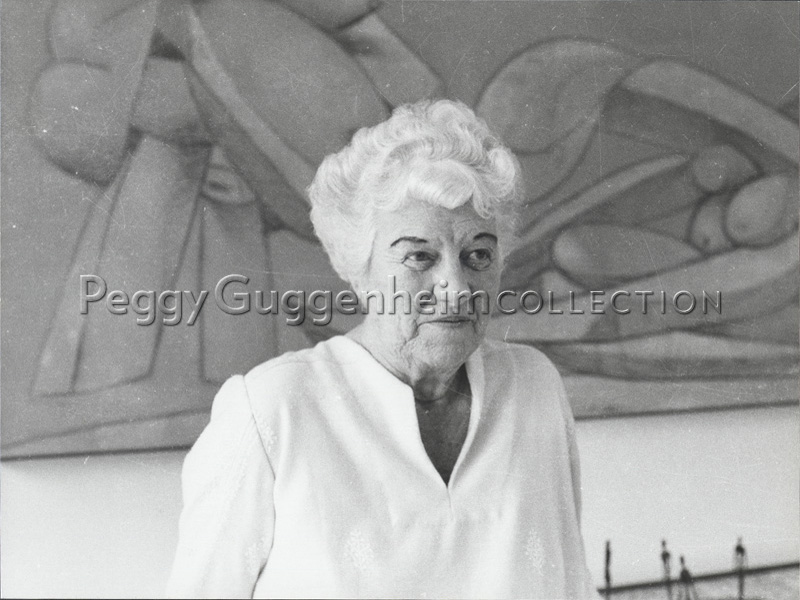 Peggy Guggenheim in abito chiaro nella sala di ingresso di Palazzo Venier dei Leoni. Alle sue spalle alcune opere della sua collezione, anni '70