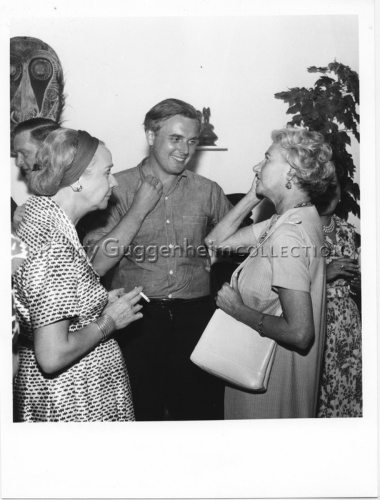 Nelly van Doesburg, writer Timothy Hennessy and Peggy Guggenheim (left to right) at the opening of the exhibition Black Primitive Art organized by Paolo Barozzi; Venice, early 1960s.