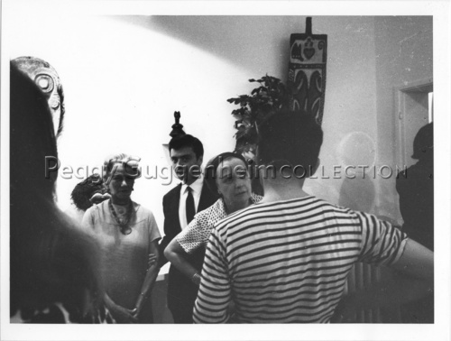Peggy Guggenheim, Paolo Barozzi and Nelly van Doesburg (left to right) at the opening of the exhibition "Black Primitive Art" organized by Barozzi; Venice, early 1960s.