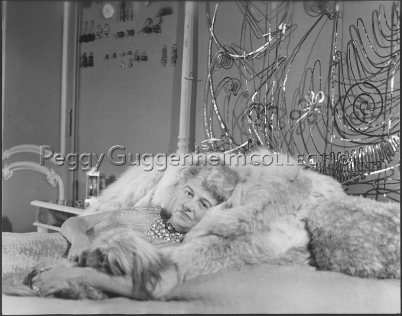 Peggy Guggenheim distesa sul suo letto a Palazzo Venier dei Leoni, indossa un abito disegnato per lei da Mariano Fortuny, anni '60