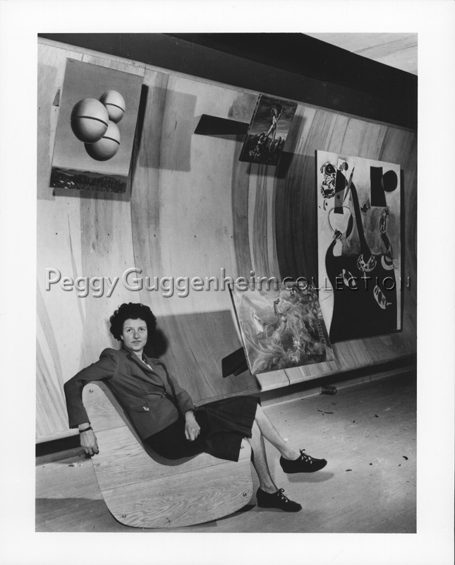 Peggy Guggenheim nella sala dedicata ai surrealisti nella galleria Art of This Century, 1942.