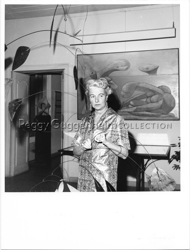 Peggy Guggenheim in the entrance hall of Palazzo Venier dei Leoni with Alexander Calder, Arc of Petals (1941, PGC); behind her Pablo Picasso, On the Beach (1937, PGC); through the door Antoine Pevsner, Developable Surface (1938, PGC); Venice, early 1960s