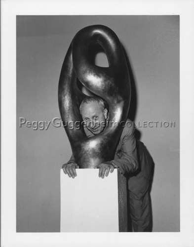 Jean Arp with his sculpture "Ptolemi" (1953)