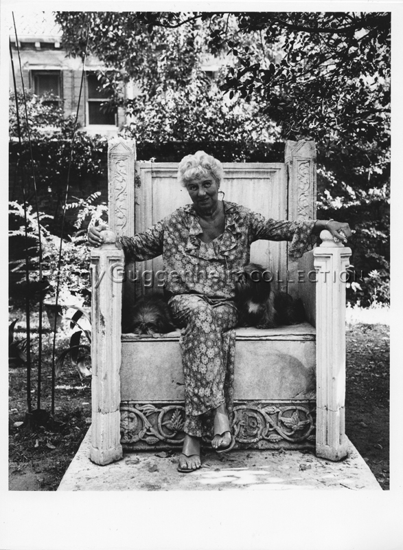 Peggy Guggenheim sul trono nel giardino di Palazzo Venier dei Leoni; a sinistra Takis, "Segnale" (1958, PGC); Venezia, 1970