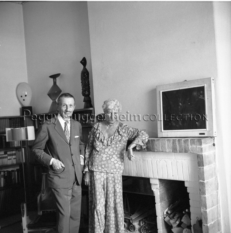Peggy Guggenheim con l'artista George Giusti a Palazzo Venier dei Leoni, accanto a Giusti, "Incubo in verde n. 2" (data e ubicazione sconosciute); Venezia, 1970