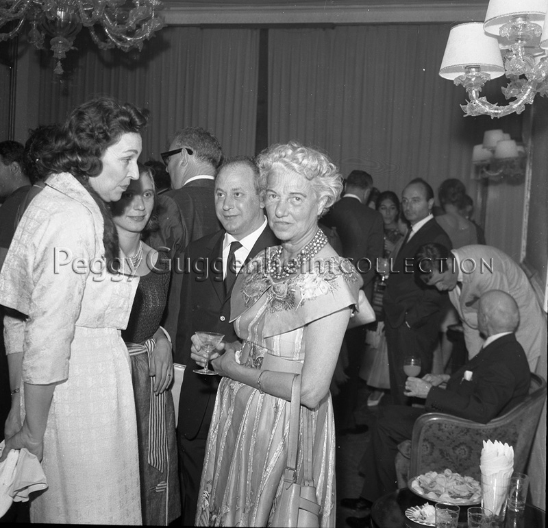 Painter Matelda Capisani, Peggy Guggenheim, Paolo Barozzi (left to right) at the opening of the exhibition "Black Primitive Art" organized by Barozzi; Venice, early 1960s.