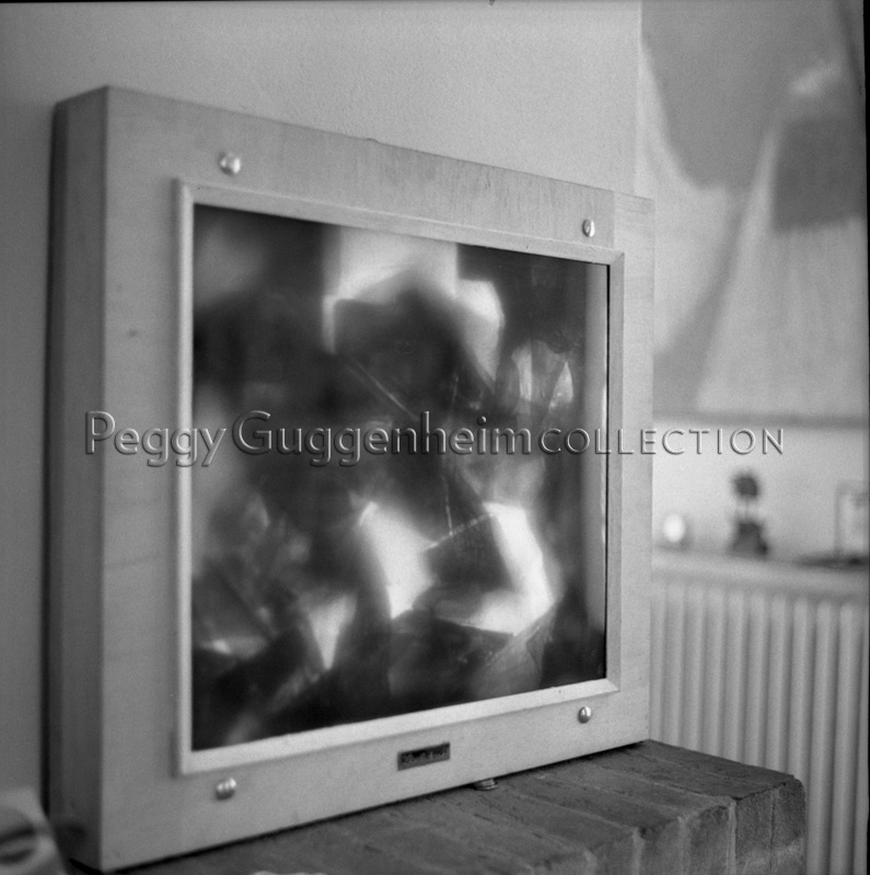 "Incubo in verde n. 2" di George Giusti, opera posata sul caminetto della biblioteca di Palazzo Venier dei Leoni; Venezia, 1970