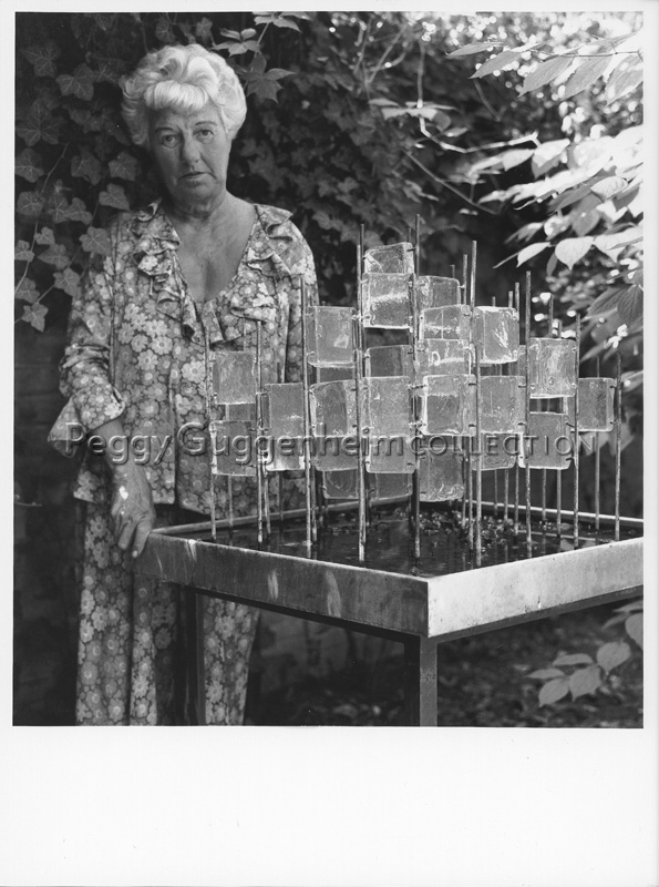 Peggy Guggenheim in the garden of Palazzo Venier dei Leoni next to Mikuni Omura, Opera 3 (unknown date and location), made by La Fucina degli Angeli of Egidio Costantini; Venice, 1970