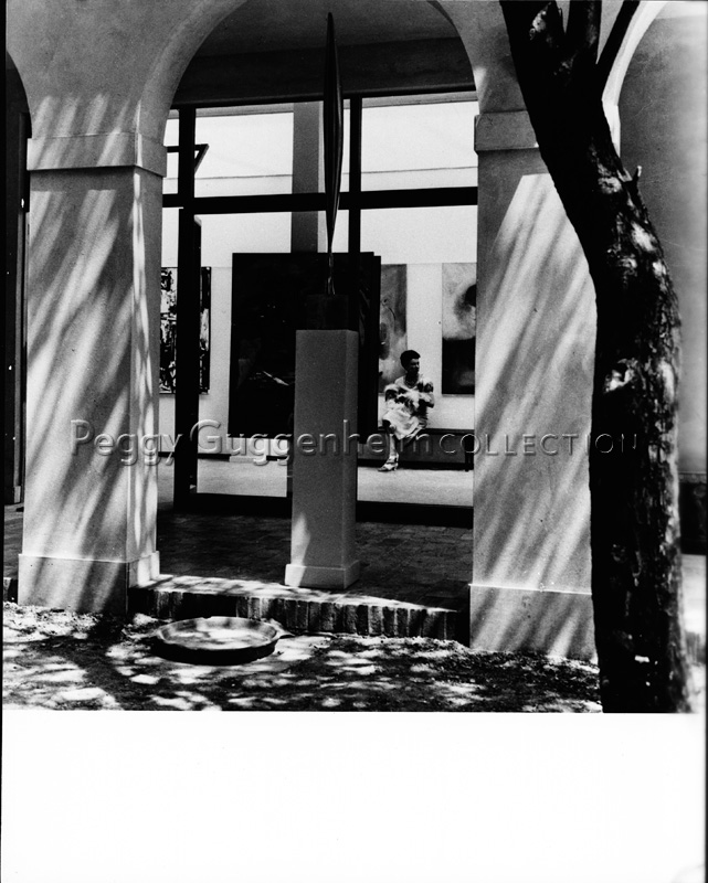 Peggy Guggenheim seduta tra le opere della sua collezione esposte nella barchessa di Palazzo Venier dei Leoni. Venezia, primi anni '50